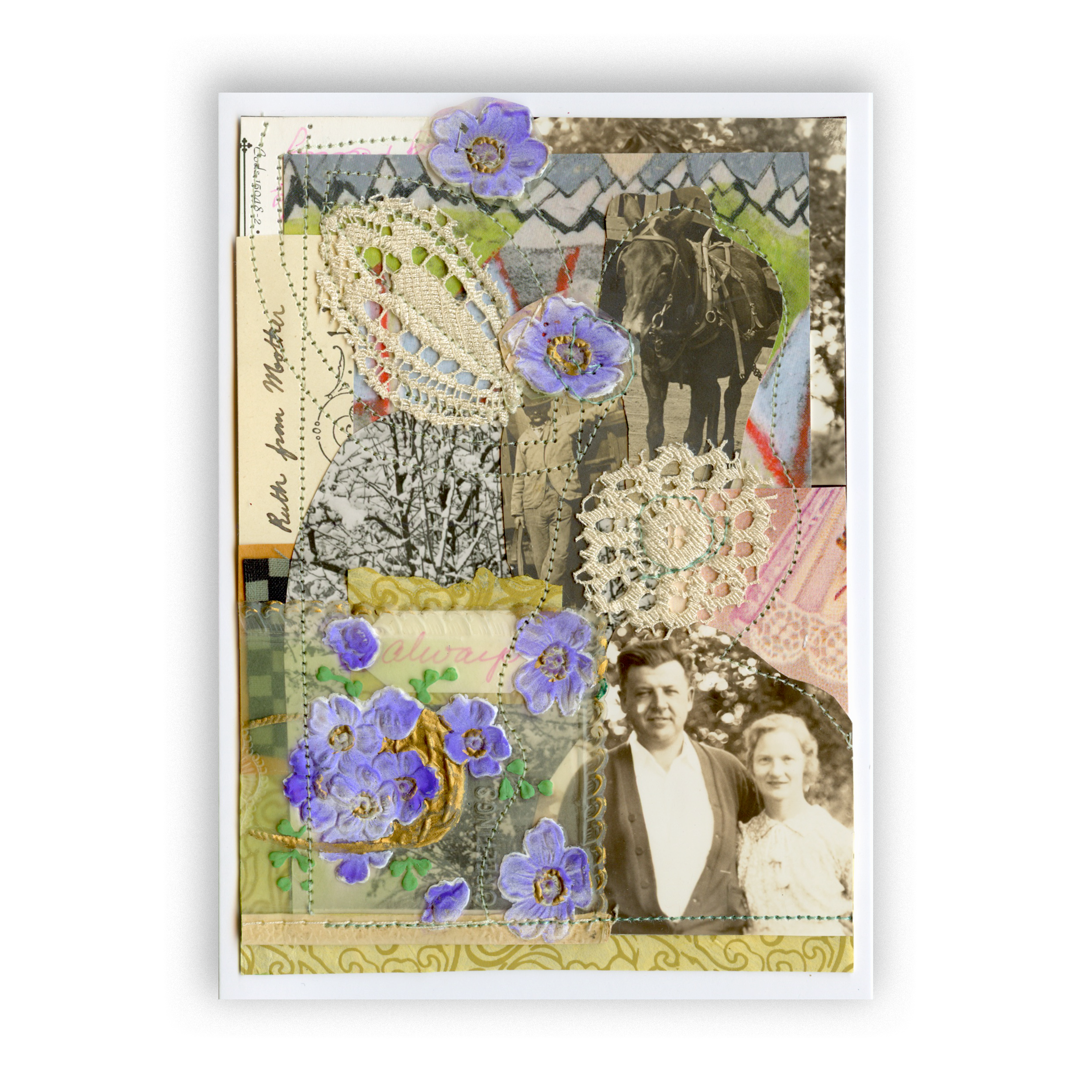 Storytime (featuring a handwritten text “story” included with the art piece) | Vintage (featuring a vintage focus collage piece) | Travel (featuring travel postcards and stamps) | Samples (featuring fabric from my mother’s handmade catalog of fabric samples) | Memories (featuring a photograph from my personal childhood collection - sample below) | XO (offerings of love)